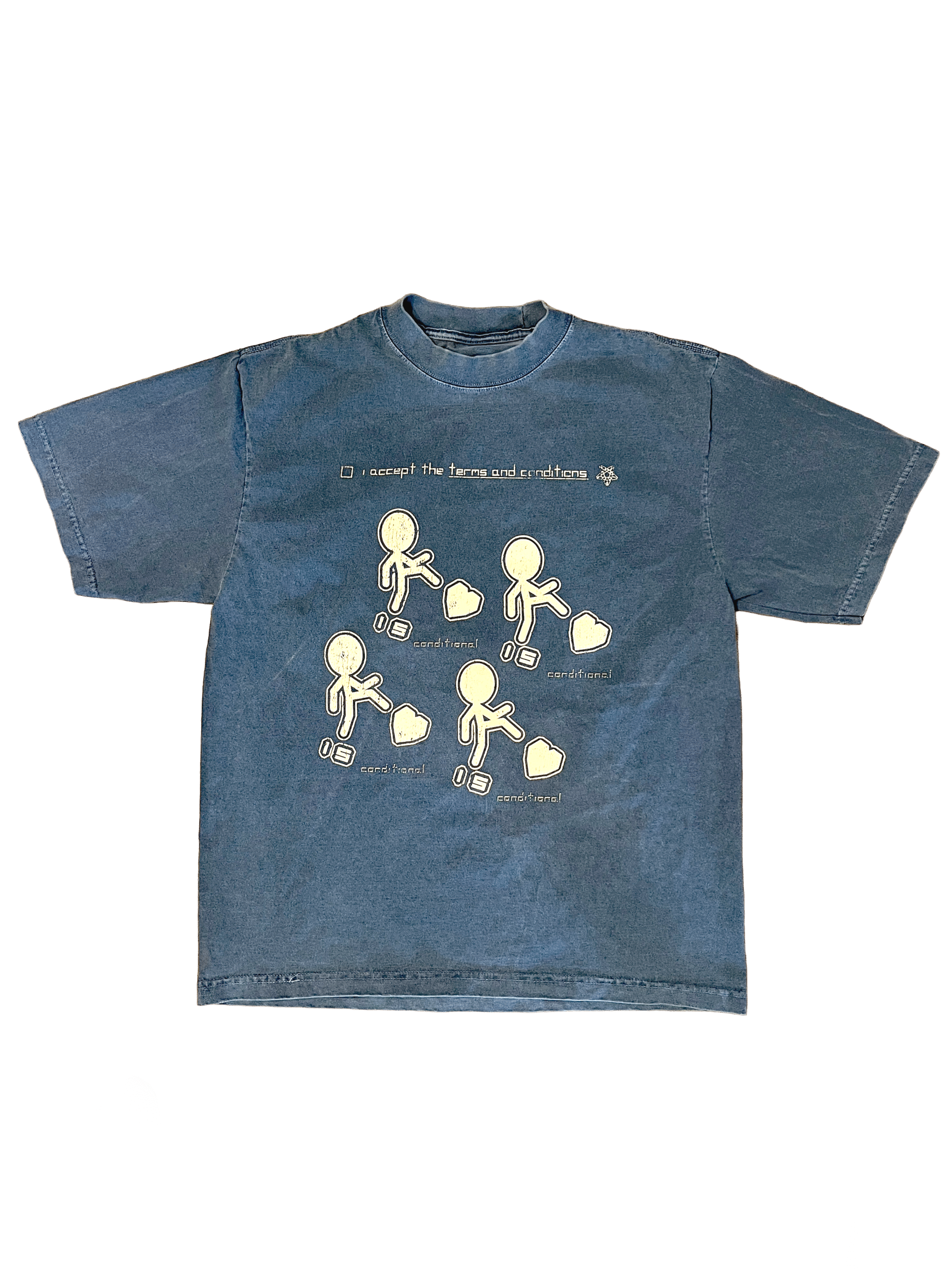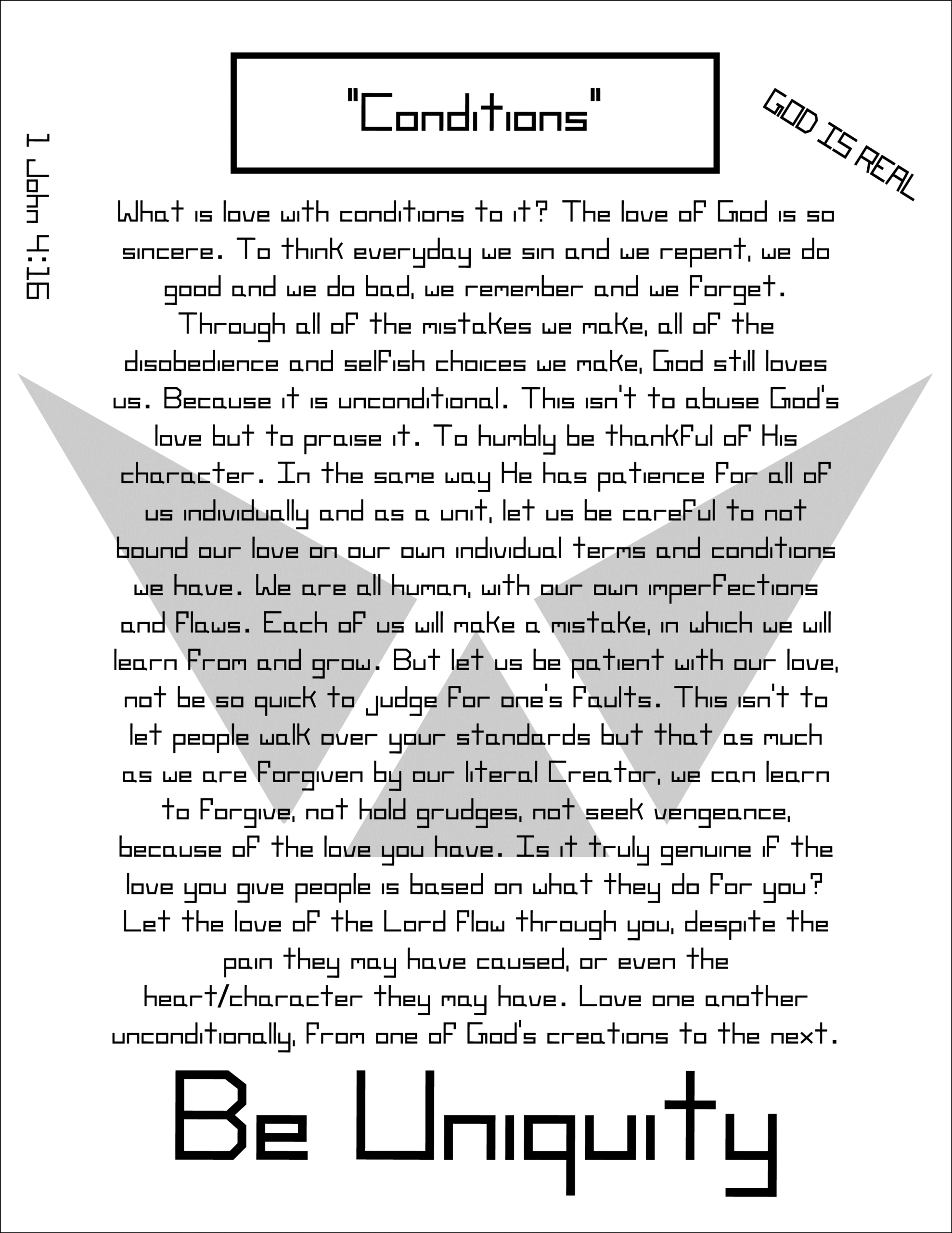 From the empty box not accepting the underlined terms and conditions to the actual design of the conditions, this design is full of double entendres and contrasts. The figure is using leverage from the “is” to kick over the heart, giving it that tilted angle. Below each, it says conditional to finish the sentence which can be read “is love conditional” or “love is conditional”. This is the term and condition that’s not accepted because love isn’t based on our own criteria and qualifications. We love in despite of our imperfection. To the right of the terms is our logo, in radial format which creates a star because we are all stars in despite of our flaws and faults.