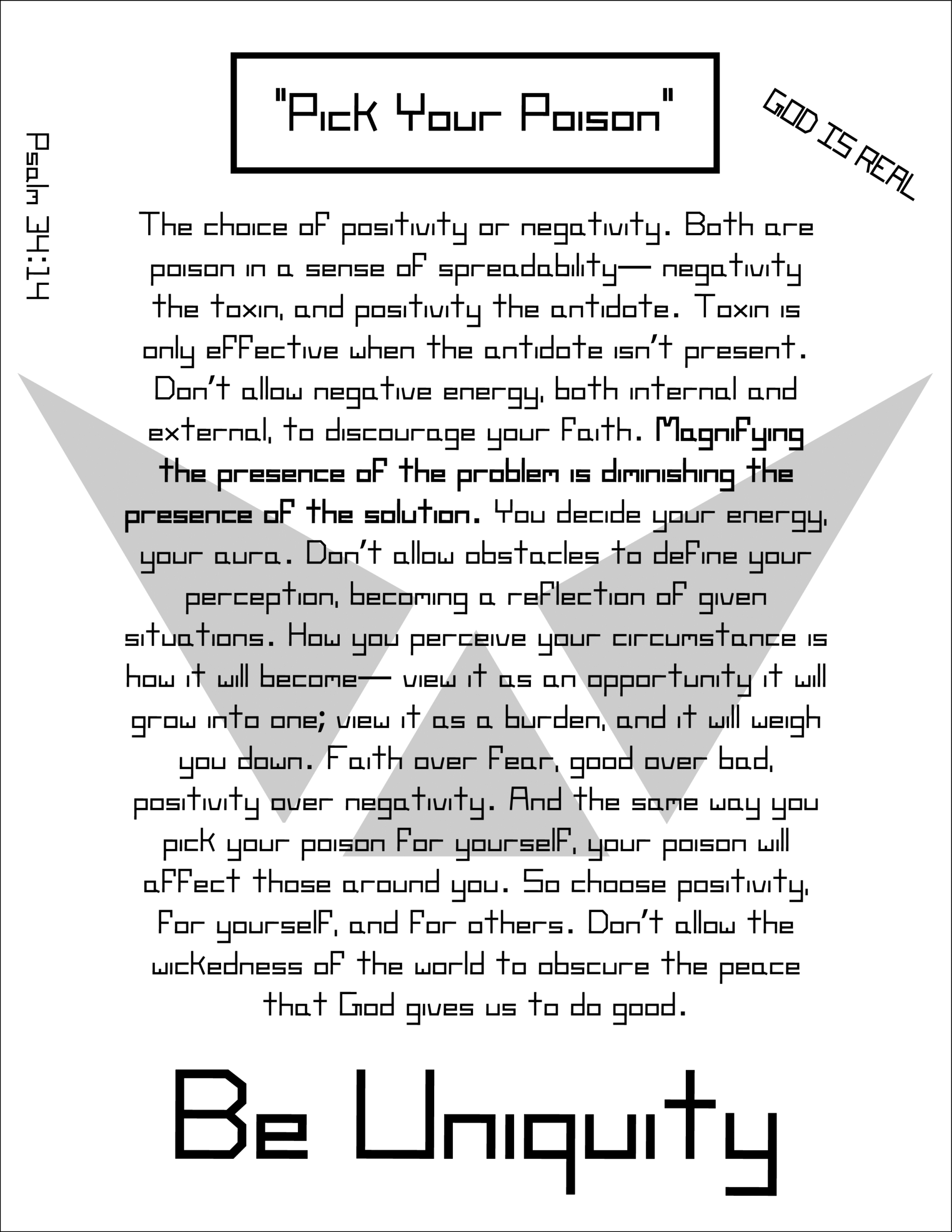 A smily face in the upper right hand corner, and frown face upside down in the bottom left hand corner. A small conjoined area in the middle, small for a reason showing that you can’t choose good and bad and expect it to end good for you. Yellow + blue = green but that green is just the comparable; middle ground if you will.