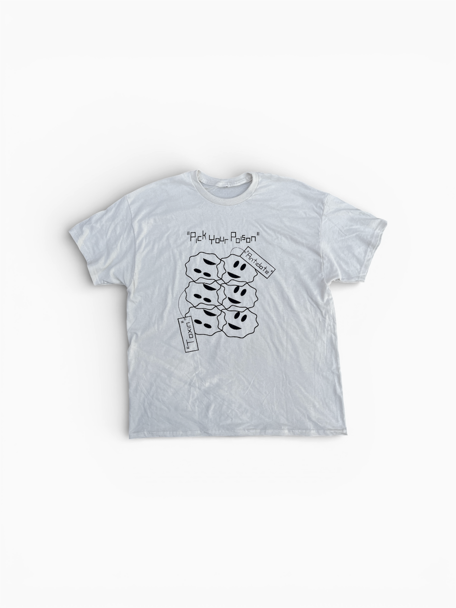 The design conceptualizes the choice we have of positivity energy and negativity energy— internally and externally. The price tags attached show that they both come with a cost, not in money but in opposition. The antidote against the toxin. How you perceive things and view it is the reality it will become. The smiley face views itself as right-side up as does the frowny face. But the mouths are both in the same direction. The only difference is the position of the eyes, aka the perception.