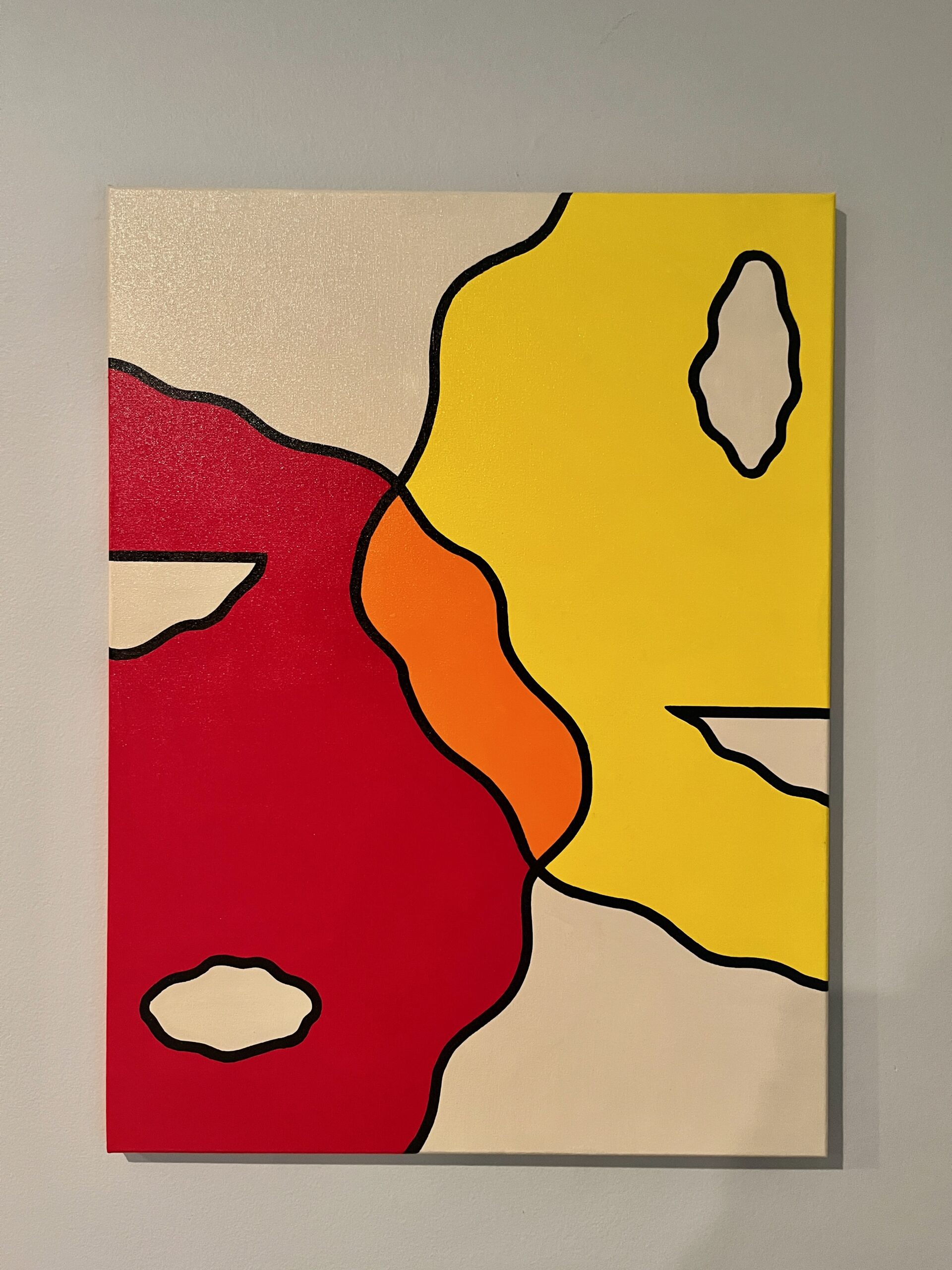 A smily face in the upper right hand corner, and frown face upside down in the bottom left hand corner. A small conjoined area in the middle, small for a reason showing that you can’t choose good and bad and expect it to end good for you. Yellow + blue = green but that green is just the comparable; middle ground if you will.